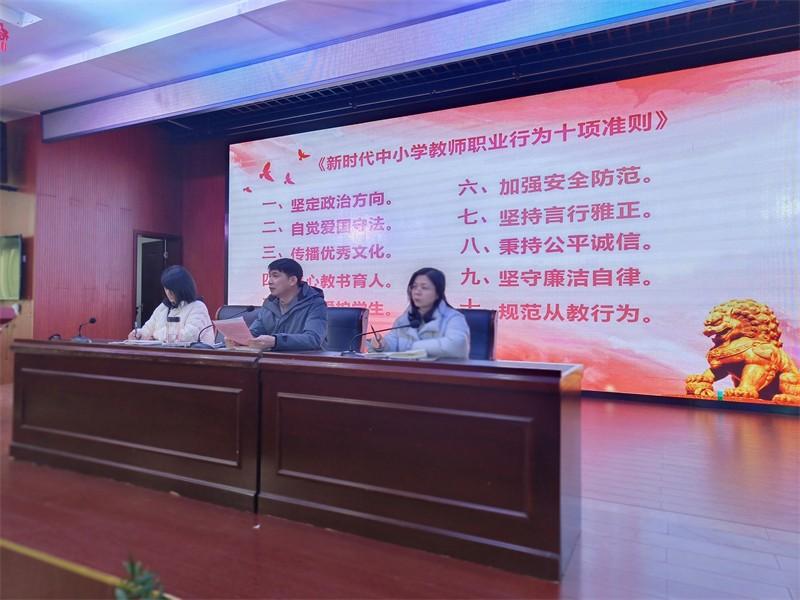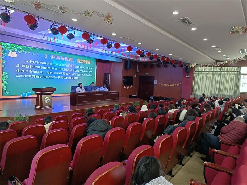 刘新平校长首先进行了2024年寒假师德师风专题教育,以《学生眼中好老师的十条标准》为主题,为全体教师如何成为好老师提供了参考标准,随后跟老师们重温了习近平总书记在2014年和北师大师生代表座谈时提出的要做“四有”好老师,即有理想信念、有道德情操、有扎实学识、有仁爱之心,同时也重点强调了《新时代中小学教师职业行为十项准则》。接着,刘校长对假期生活提点以下几点建议:第一、欢度新春佳节之际,也要注重学习。相关教师在寒假期间认真提升自己的学科专业素养能力、教学基本能力、教育理论与教科能力,要抓住这一专业发展的契机。第二、提倡过文明祥和之年,严格遵守社会公德。外出苏州要报备,不赌博,不酗酒,酒后绝不能开车,对照教师职业行为十项准则注意教师的形象,尤其是自己的言行。第三、班级群对孩子的寒假生活与学习作正面的提示与引导,关注孩子的心理健康教育及生命教育。第四、上网要注意网络言行要规范,要遵守道德,做到廉洁自律,严禁有偿家教。第五、提示下学期的教师、行政与后勤报到时间,要做好开学工作准备及卫生工作。第六、进入冬季转季节,请全体德育导师要关心学生的心理情绪变化,做好排查与整改,化解好学生心理、家庭矛盾、校园欺凌等重点领域的风险,有苗头性的特殊学生要及时上报学校德育处,同时强调做好冬季火灾、用电等消防安全。第七、请全体教职工严格遵守《关于进一步规范全区教育系统教师网络行为的通知》、《新时代中小学教师职业行为十项准则》,净化朋友圈、网络行为,弘扬宣传正能量。严禁有偿家教、体罚或变相体罚等违反师德的行为,一经查实,将按规定严肃处理,这是底线与红线千万碰不得。最后,刘校长也向全体教师送上寒假与春节的祝福。