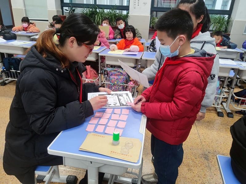 二年级语文设置了“词语大闯关”“朗读大闯关”“积累多多”“看图说话”四个关卡,考查孩子对阅读文字、语言积累的能力。老师们耐心、细致地倾听孩子们的朗读,鼓励孩子们沉着发挥,那一张张笑脸,便是最好的奖赏。