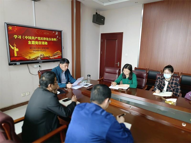 为进一步强化党员教师的纪律意识,提升党性修养,4月16日下午,吴江区八坼小学党支部组织全体在职党员学习《中国共产党纪律处分条例》开展主题党日活动,由党支部书记刘新平主持,旨在深入贯彻习近平总书记关于党纪学习教育的重要讲话和重要指示精神,推动支部党员教师将党纪学习教育内化于心、外化于行。