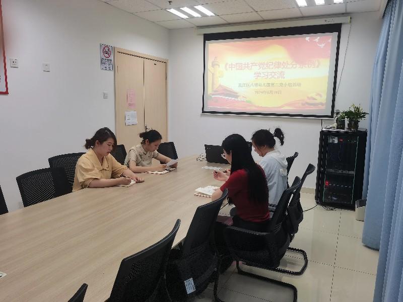 近期,吴江区八坼小学党支部第二党小组八坼幼儿园全体党员组织学习了《中国共产党纪律处分条例》,使大家认识到要增强遵规守纪的自觉,坚持把纪律挺在前面,促进执纪执法贯通,准确运用“四种形态”,落实“三个区分开来”,把从严管理监督和鼓励担当作为高度统一起来。