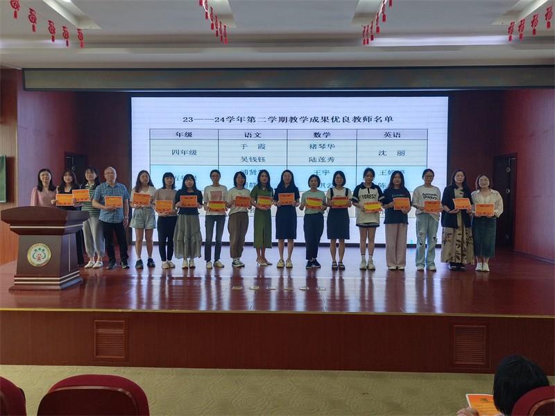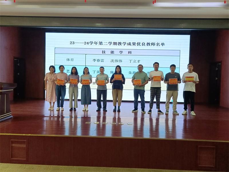 第三项议程,表彰在本学期教学质量优异的老师。教导处主任曹燕南宣布获奖名单,刘新平校长等三位校级领导分别为获奖教师颁发荣誉证书,并合影留念。全体教师送上祝贺的掌声。