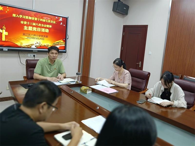 9月20日下午,吴江区八坼小学党支部在三楼会议室组织开展9月主题党日活动,主题为“深入学习贯彻省委十四届七次全会、市委十三届八次全会精神”,全体党员参加本次活动,学校党支部书记、校长刘新平主持。