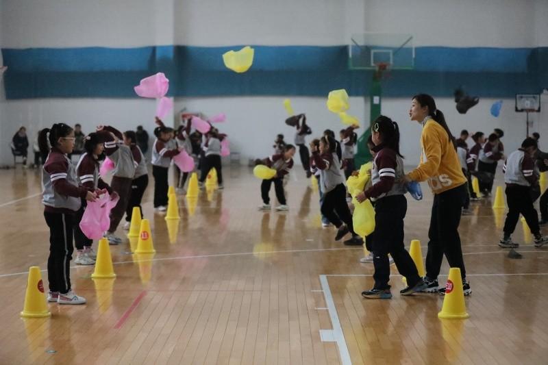 在活动中,五位来自吴江区各个学校的体育老师执教上课。八坼小学的仲俊豪老师精心准备了生动有趣的彩带龙课程。苏大附校的汤亮老师也带来的精彩课程——匍匐、攀爬和钻爬的组合练习课程。花港迎春小学的季雨老师为学生们带来了的是篮球双手胸前传球的课程。黎里小学的张全权老师带领学生们体验了别具一格的迎面接力跑课程。最后,思贤实验小学的阚卿菡老师带着学生进行了移动性技能训练,课程内容包丰富,包括反应、灵敏练习与游戏。