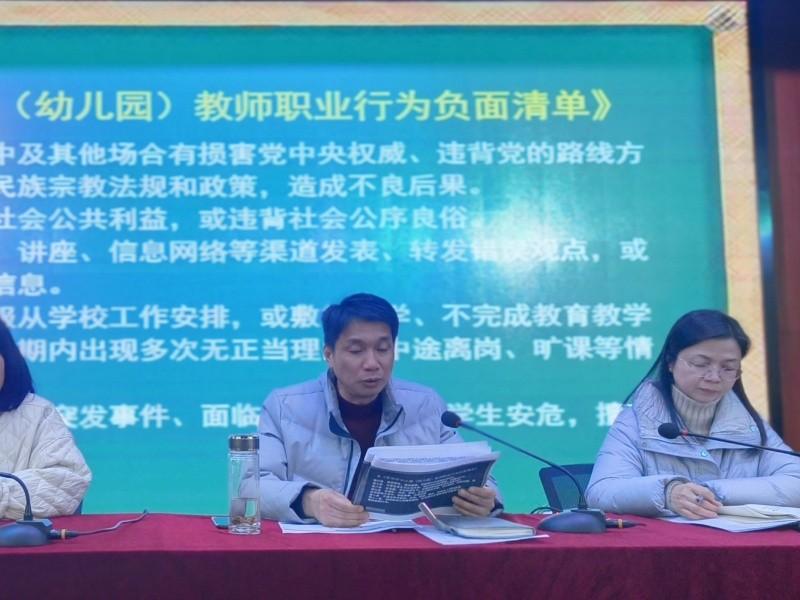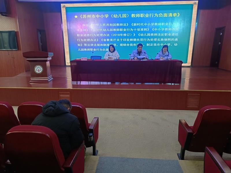 第四项议程,刘校长进行了“扬师德 铸师魂”师德师风专题培训,组织全体教师重点学习《苏州市中小学(幼儿园)教师职业行为负面清单》,根据《中华人民共和国教师法》《新时代中小学教师职业行为十项准则》《新时代幼儿园教师职业行为十项准则》《中小学教师违反职业道德行为处理办法(2018年修订)》《幼儿园教师违反职业道德行为处理办法》《省教育厅关于印发师德失范行为处理实施细则的通知》等法律法规和制度规范制定。在负面清单中,共有十五条违反教师职业道德的行为,刘校长要求大家谨记要求,坚决不碰触师德红线和底线,不参与校外培训机构和有偿补课、不索要学生及家长财物、不乱购教辅材料、不体罚和变相体罚学生、不在网络媒体发布不良信息,廉洁从教,严格执行。如有违规,学校师德考核将采取“一票否决制”,影响个人年度考核、职级晋升和评优评先等。