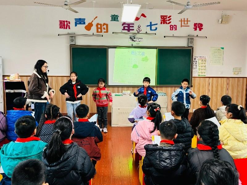 12日,林贞雪老师执教了一节三(3)班的音乐课,课题为《旅行之歌》。课的开始,林老师让学生聆听三首不同风格的音乐作品,做出相应的肢体动作,引出进行曲风格的歌曲《旅行之歌》的学习。然后创设情境,以小鸟衔来几片树叶的形式,导出本课附点节奏的重难点学习,学生在趣味学习中,轻松地掌握了重难点。接着,林老师细致地指导学生学唱歌曲,歌谱、歌词练唱得都比较扎实。歌表演环节,注重了全员参与,让学生动起来,符合本课歌曲的风格特点,也让课堂气氛推向了高潮,教学效果不错。