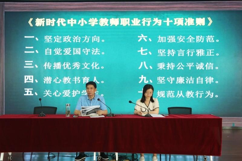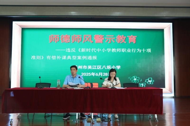 (二)加强教师师德师风教育,明确“双减”背景下严禁教师有偿补课的重要意义。6月28日上午,学校在期末教师会议上对教师开展暑期师德师风专项教育。刘新平校长首先传达了吴教人〔2025〕19号文件《关于转发<关于组织开展师德警示教育的通知>的通知》,结合苏教师函〔2025〕11号文件《省教育厅关于师德师风违纪典型案例情况的通报》的典型案例对全体教师进行警示教育,再次强调严格遵守《新时代中小学教师职业行为十项准则》,“八小时以外”同样要高度自律。随后,他对在职教师严禁有偿补课,严禁参与校外培训机构教学管理及兼职取酬提出明确要求,严禁收受学生和家长礼物礼金,严格规范网络行为,遵守国家法律法规和社会公德,会后全体教师都在学校暑期师德师风承诺书上签字承诺,严格遵守教师职业道德规范,守住师德“底线”,远离师德“红线”,做一个有理想信念、有道德情操、有扎实学识、有仁爱之心的“四有”好教师,着力打造清正教风。另外,利用教师QQ群、微信群进行经常性提醒。