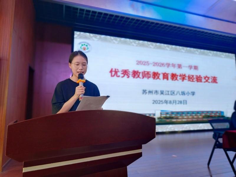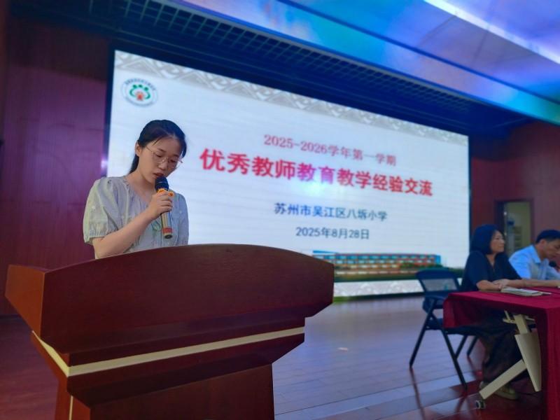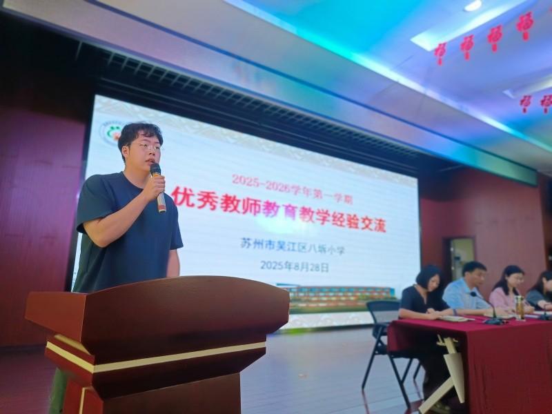 接着,进行本次教师会的第一项议程:四位分别在教学质量、班级管理、辅导学生以及个人成长等方面比较突出的优秀教师代表发言,进行经验交流。沈春红老师始终坚信“细节决定成败,方法引领效率”。她谈了“备好课:教学质量的‘根本’”、“抓好课堂:教学质量的‘主阵地’”、“抓学生作业:教学质量的‘巩固抓手’”、“背书默写:语文基础的‘坚实基石’”以上四个方面。汪春燕老师在班级管理中认为要做到:第一、班级管理久久为功,做到功观察、功交流、功记录;第二、管理班级滴水穿石。仲俊豪老师分享了学校女子篮球社团的辅导经验,在区“红双喜杯”小学生篮球比赛中交出三年两冠一亚的优异答卷。他认为,优秀的技术很重要,但是勇于拼搏、誓不言输的精神更重要。他让队员们明白“铿锵玫瑰”的绽放源于坚持,“巾帼不让须眉”的底气来自实力。戴柳老师用三重心境的转变诉说这段“向下扎根,向上生长”的旅程,第一,教学:从“知识的传递者”到“兴趣的点燃者”,第二,科研:从“教学的实践者”到“研究的践行者”,第三,成长:从“独行的旅人”到“星河中的追光者”,她将继续扎根课堂,深耕科研,与各位同行一道,以萤火之微,共筑教育之光。