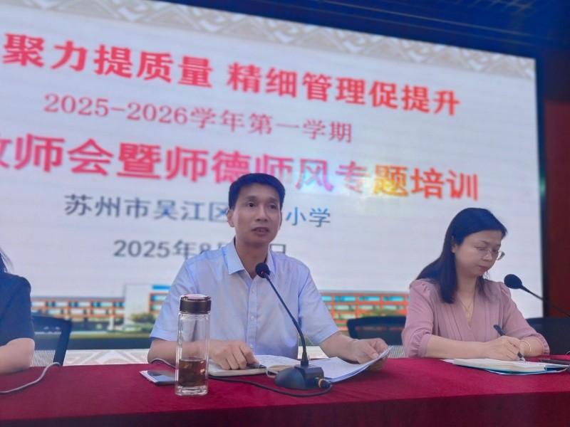 第二项议程,由校长室进行工作布置。首先,曹燕南副校长结合德育、体卫艺、科学等分管工作进行工作计划的交流。德育方面,她肯定了大家在班级管理、养成教育、心理健康等方面的做法,筑牢根基,也要清醒地看到不足和面临的挑战。她具体提出以下七个方面:第一,强化思想引领,筑牢信仰根基;第二,注重习惯养成,提升文明素养;第三,加强心理健康教育,护航学生的健康成长;第四,紧抓安全教育,守牢安全底线;第五,深耕校园活动,滋养学生心灵;第六,深化家校社携同,凝聚育人合力;第七,健强育人队伍,提升专业能力。