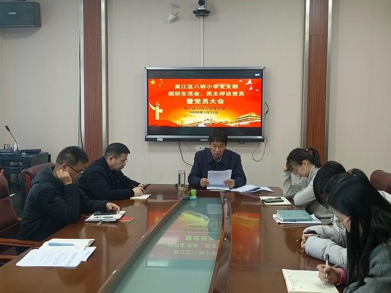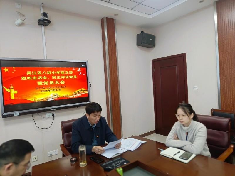3月13日下午,根据上级党组织文件精神,吴江区八坼小学党支部全体党员集中行政楼三楼会议室召开2025年度组织生活会,民主评议党员,同时也作为2026年度第一季度党员大会。由学校党支部书记、校长刘新平主持。本次会议旨在通过深入的交流与评议,强化党员干部的责任意识,提升党组织的凝聚力和战斗力,为学校教育事业发展注入强大动力。